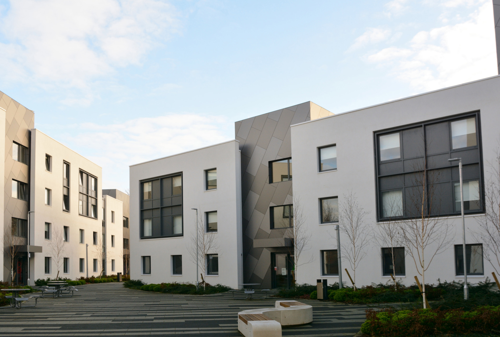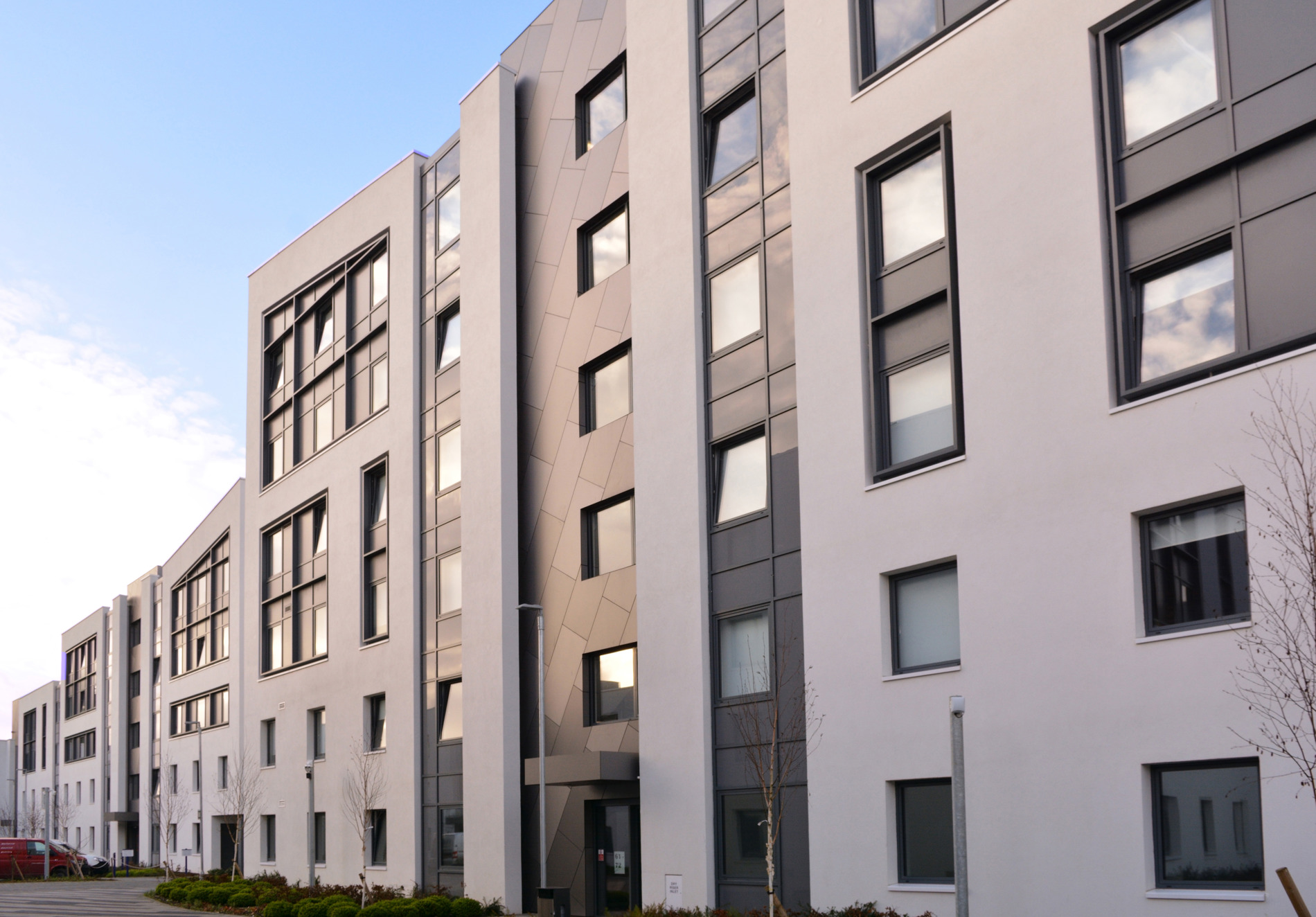 Rhodaus Town is a student accommodation development comprising of 432 bedrooms in Canterbury, now known as Petros Court it lies behind the Christ Church University Library and student services building. The building covered 3 floors and the façade surface area was 1,500m2 using Trespa, Mateon panel fixed in a diagonal pattern. The subframe was the RJ Facades EVT system with custom extruded top hats designed to span 1.2m, the panels were then structurally bonded to the top hat using Dow 896 to create a secret fix appearance.