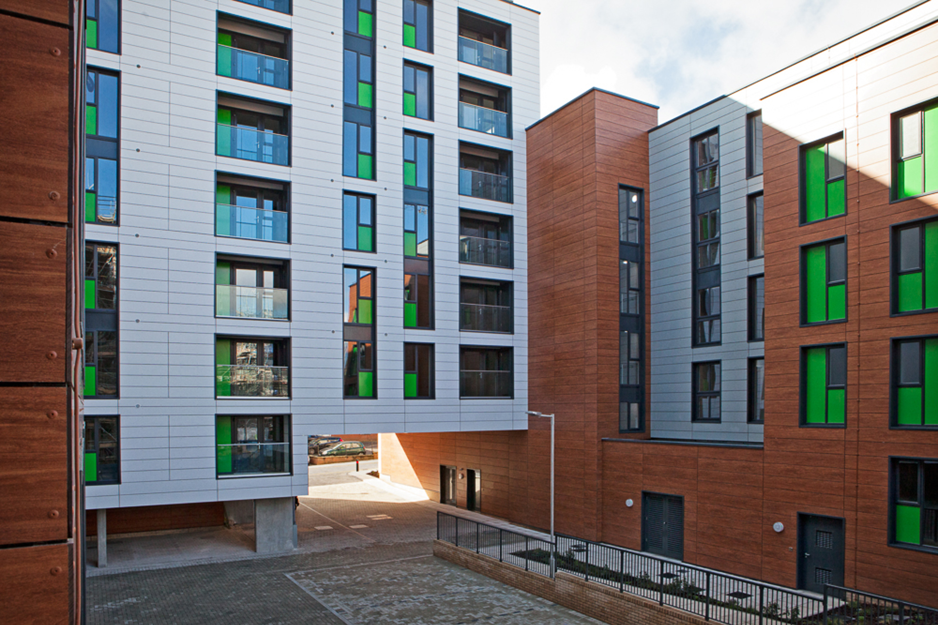 The Former Fruit & Veg market is a transformation of a rundown district in Southampton into a flagship residential and commercial development. The development is a £60m project in the up-and-coming Queensway district, the project creates 84 one bedroom and 195 two-bedroom apartments over three blocks, as well as a commercial space and green space to revitalise the prominent area of the city. The façade surface area is 10,000m2 of a mixture of Eternit, Equitone Natura, Formica Vivix and vertical hung GeBrick façade systems. All facades were supported by the RJ Facades EVT substructure and vertical rails with a full fixings package.