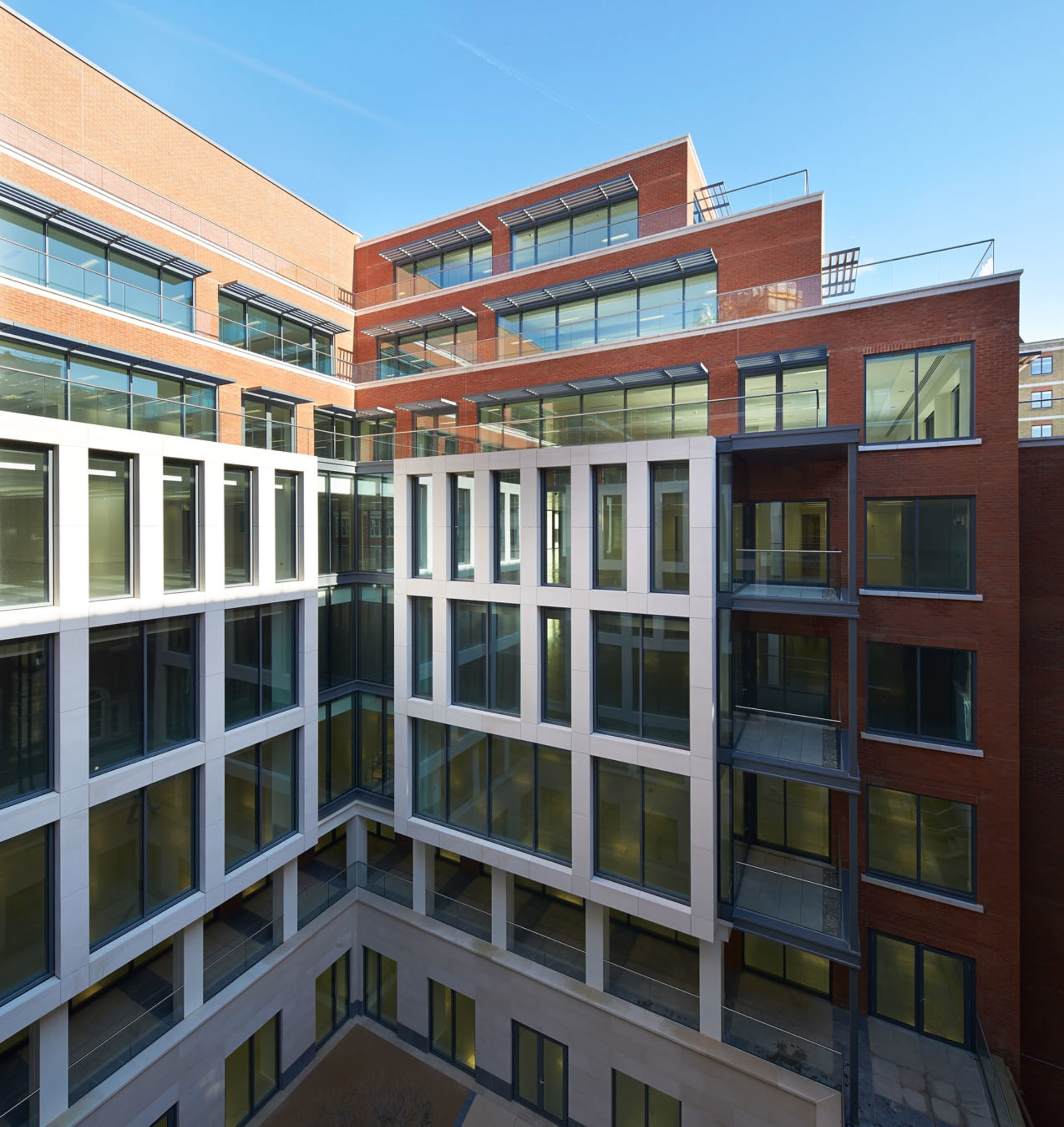 St James square is a residential development adjacent to and within a Grade II* listed office building which was originally built in the 1700s for William Wentworth, 2nd Earl of Strafford. With developing adjacent to and within a building with statutory protection comes many complexities which require careful consideration, especially at the interfaces between the existing grade II building and the new main façade. The project consists of 6 floors as a mix-use building with 13 high end apartments. The façade surface area was 1,000m2 of vertical hung Dural Limestone supported using the RJ Facades U-brackets and box sections with a horizontal profile and clasp system connected to the Limestone using FZP undercut anchors.